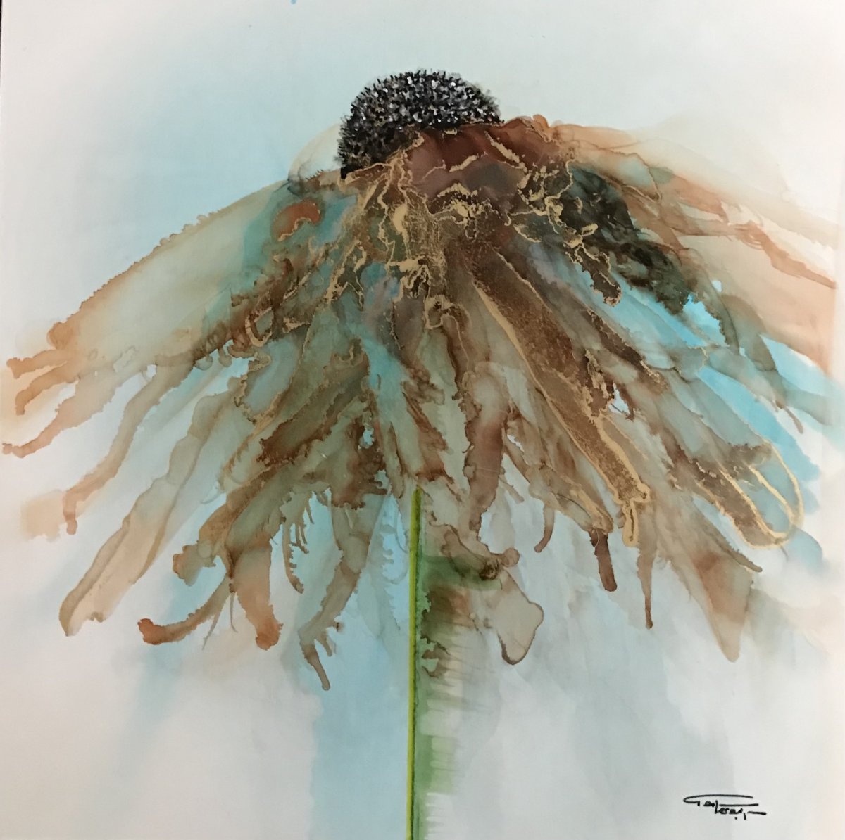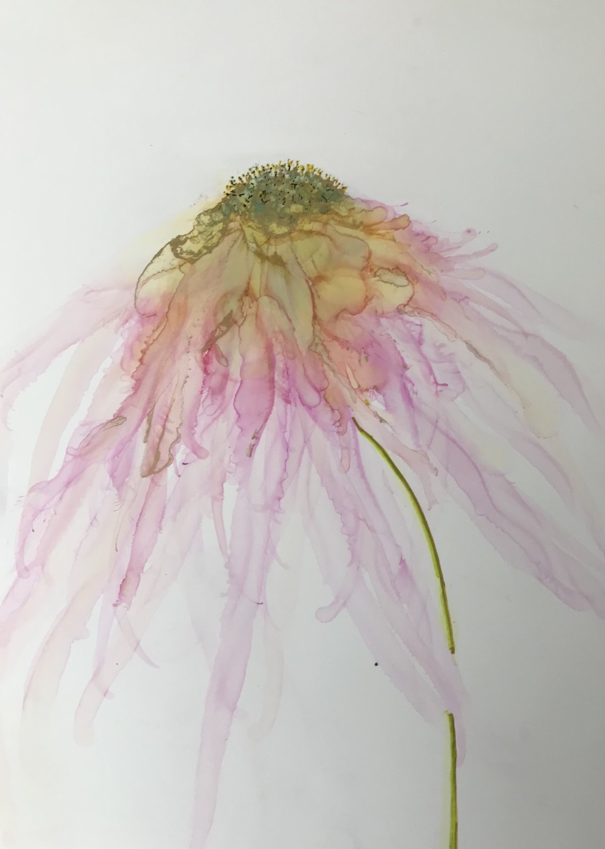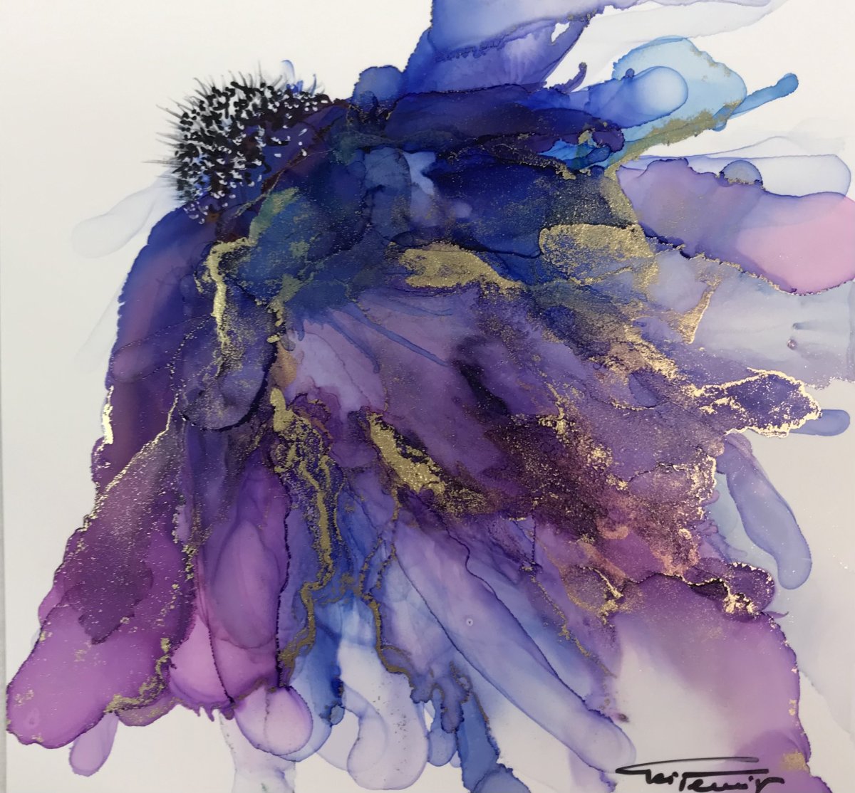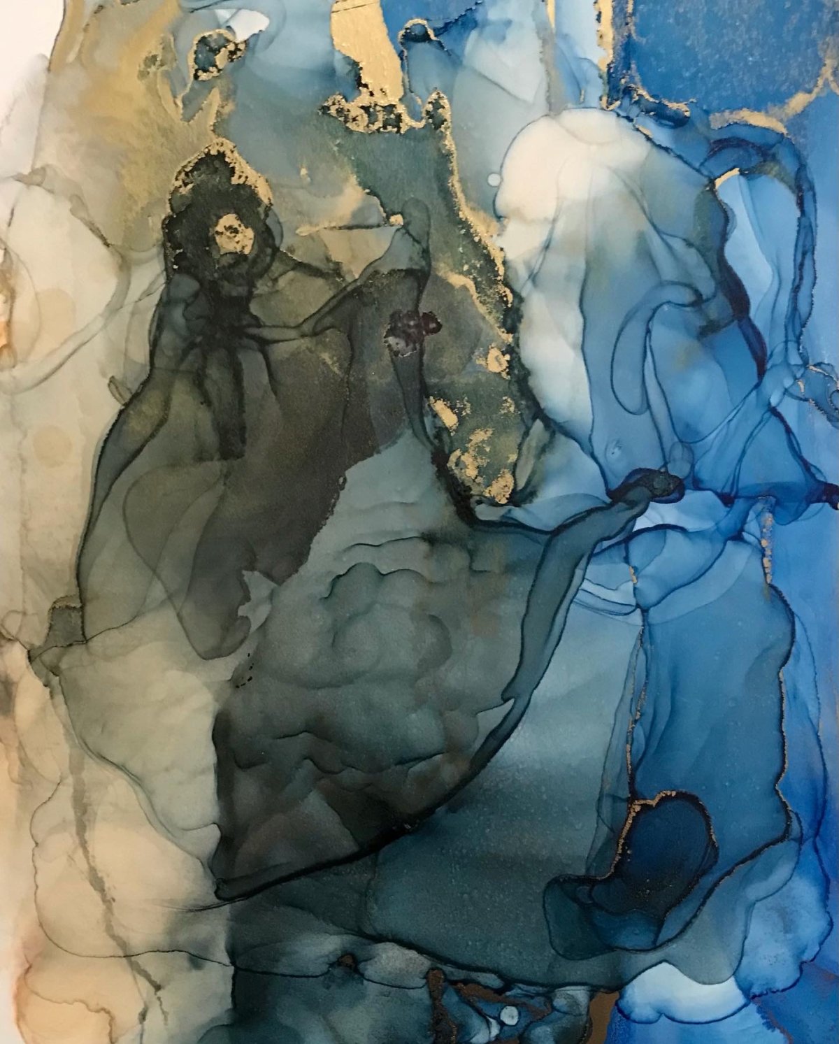 Ce sont des pigments dilués dans de l’alcool à 99,9* appelé ISOPROPANOL. Cet alcool sert également à diluer les encres afin de les rendre plus translucides. On emploie un sèche cheveux et ou d’un aérographe en fonction de l’effet escompté. On travaille sur un papier spécial appelé papier YUPO (papier ressemblant à du papier photo).